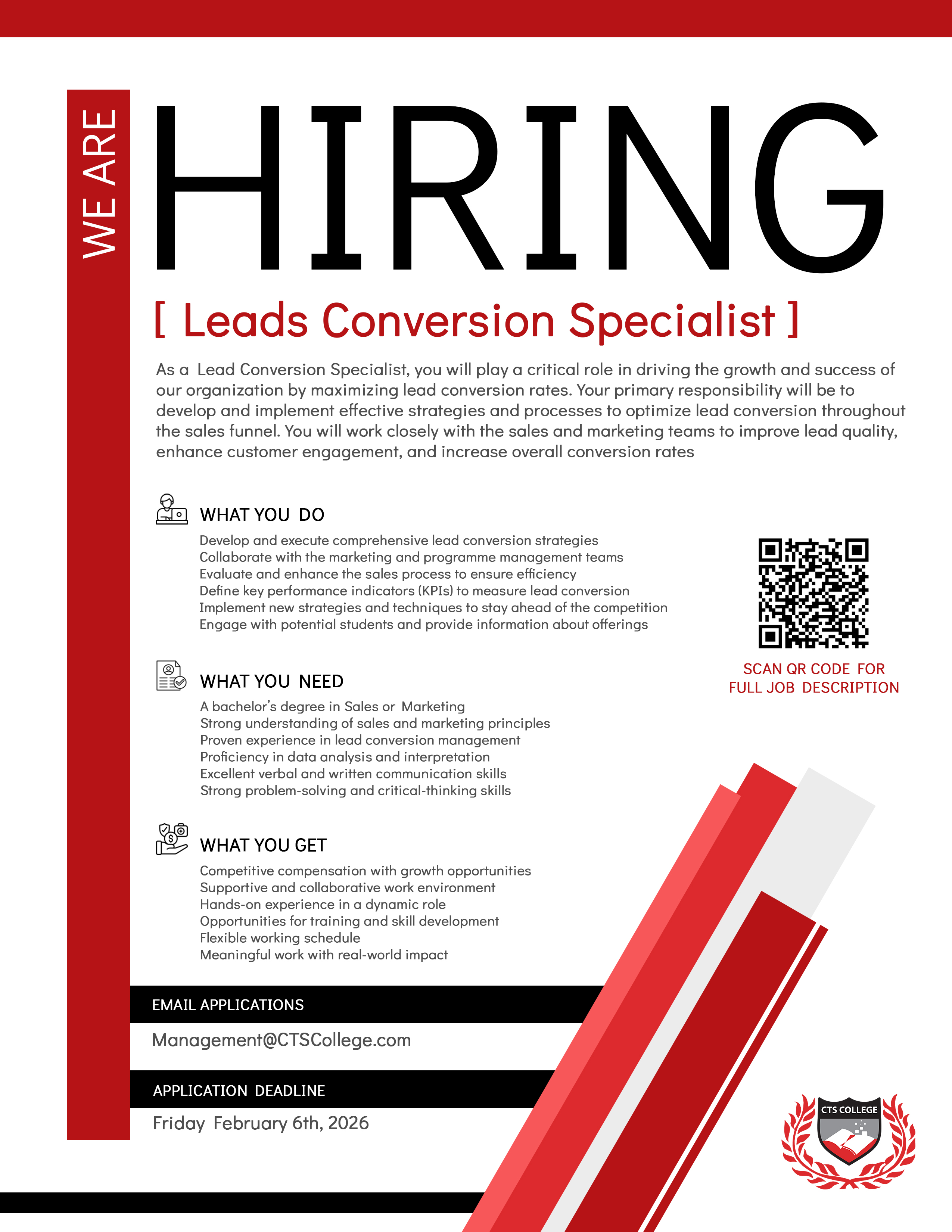 CTS College has strategic alliances with a variety of employers who are constantly recruiting from the student body. Employers or representatives from organisations would send us vacancies which we publish in our newsletter. These newsletters typically go out twice a month to our subscribers. Each year CTS College also holds a job fair with allow students to interact with employers and employment agencies. If you would like to join our list of subscribers who receive the “vacancy” newsletter please register for this service via the following link:
